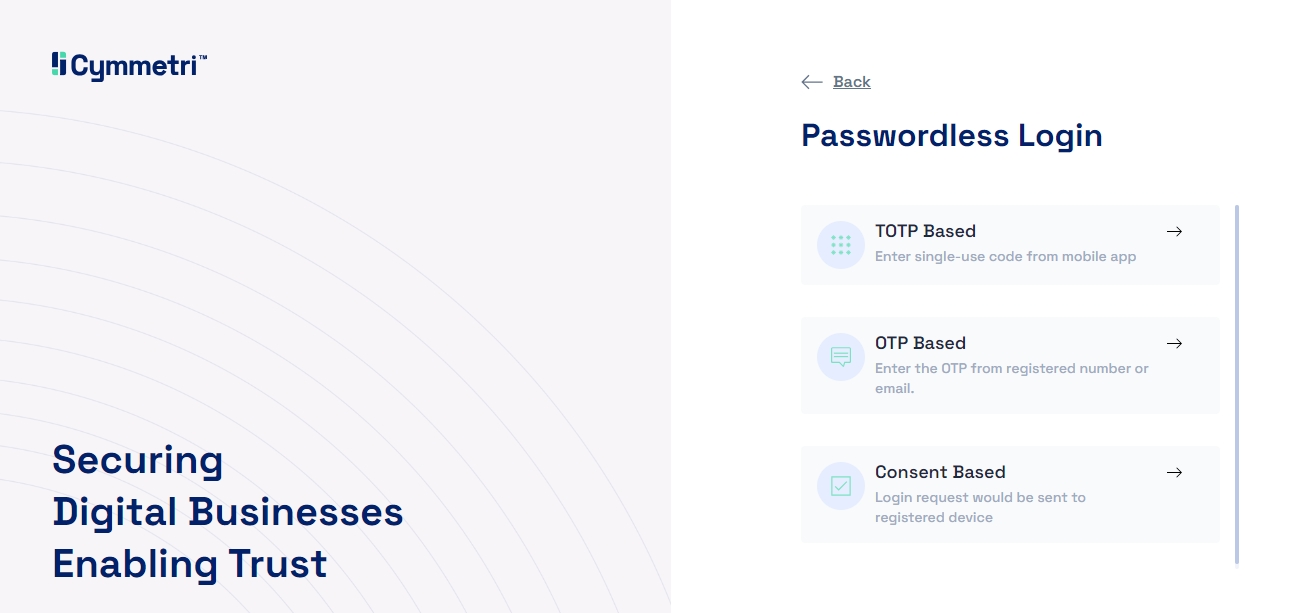 To begin the Passwordless Login flow the user needs to click on the "Login without Password" button, this will trigger the password-less login flow, will show the various registered passwordless login options.