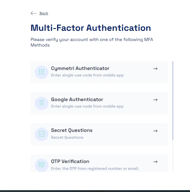 The available options visible to user depend on the MFA options enabled by the Cymmetri Administrator and the options registered by the user.