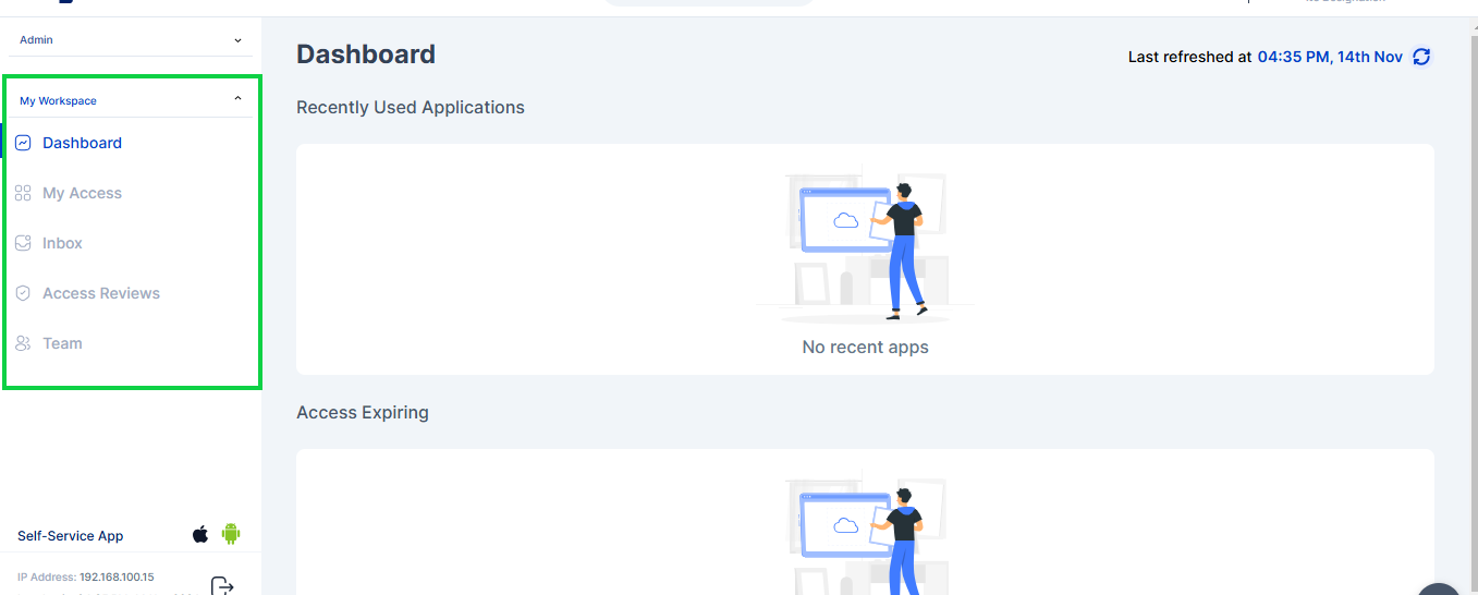 Administrators, with their privileged access, have an extended menu section labeled 'Admin' situated above the standard 'My Workspace' menu.