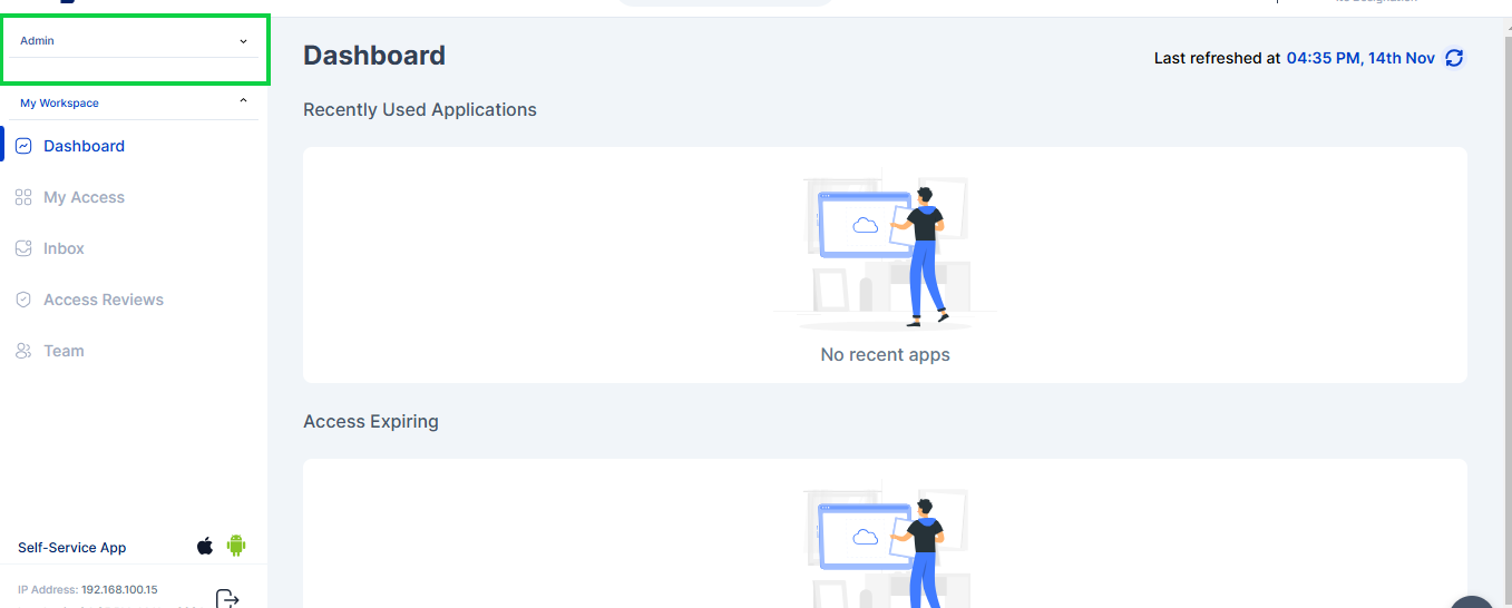Administrators can seamlessly switch between their 'My Workspace' and the 'Admin' section by selecting the corresponding option from the Main Menu Navigation.