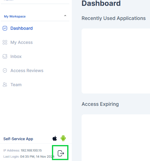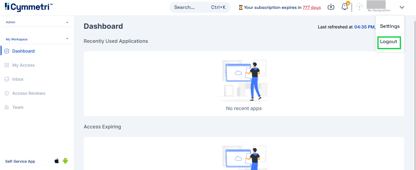 A Cymmetri user can be logged out either by the system through the time-out policy, or the user can logout using the My Workspace logout options as shown below-&#x20;
