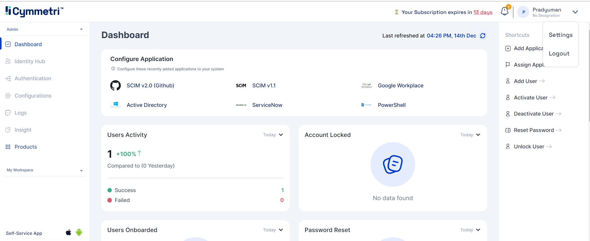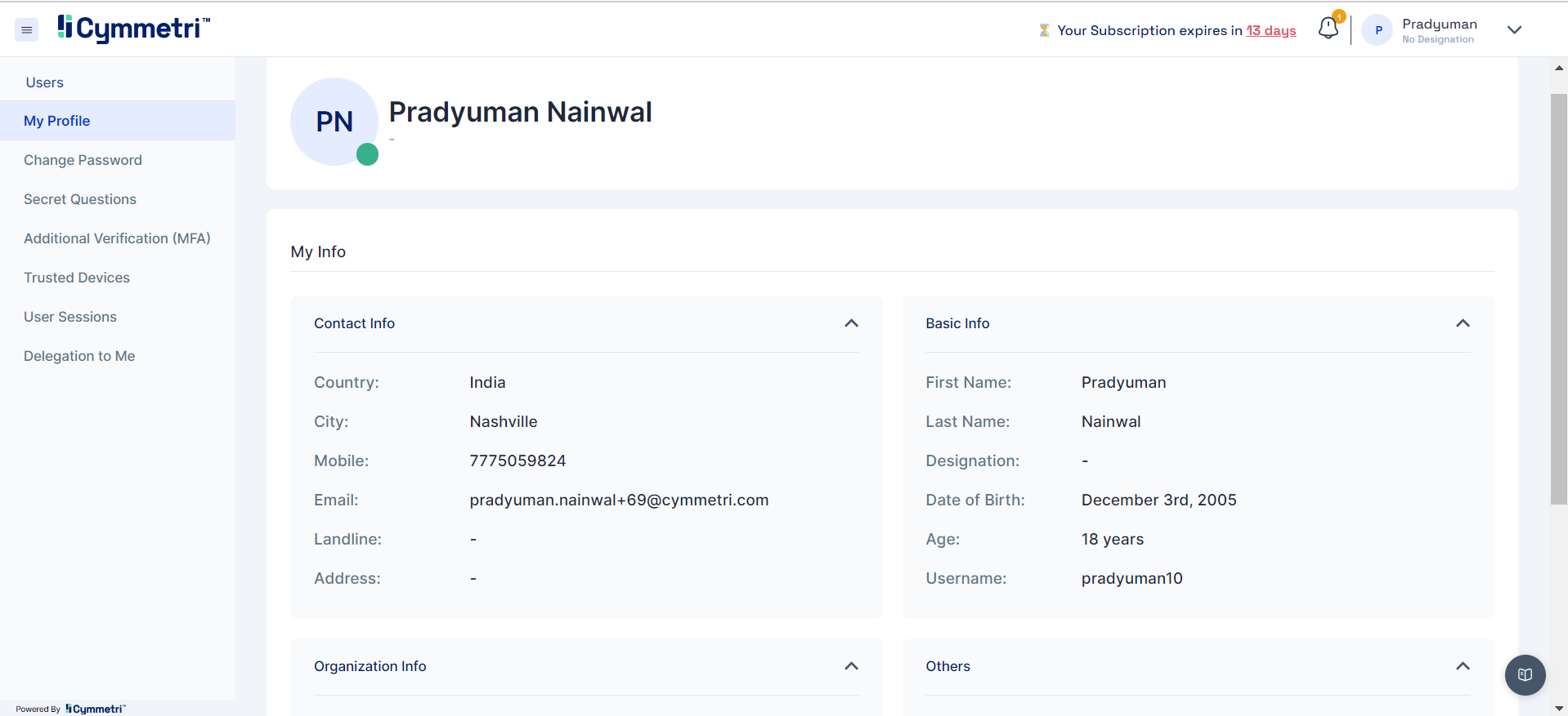 Cymmetri provides users with control over their individual account preferences, security settings, and personal information. Here are some common features and settings you can find on Cymmetri's account settings page: