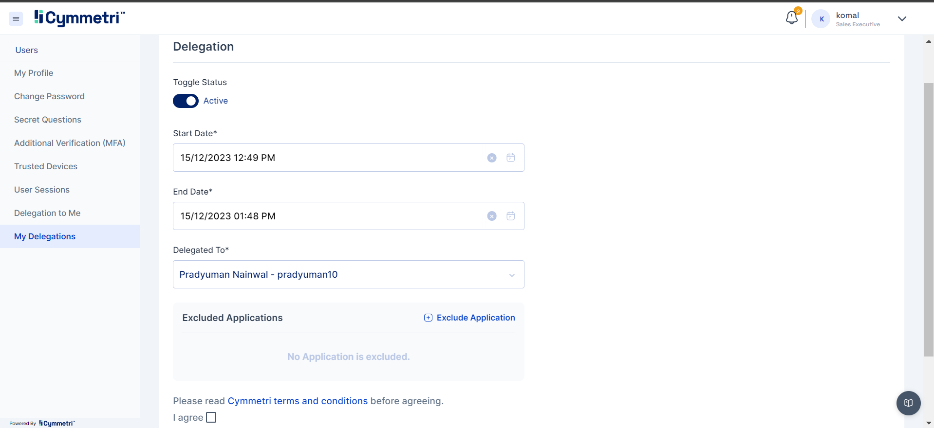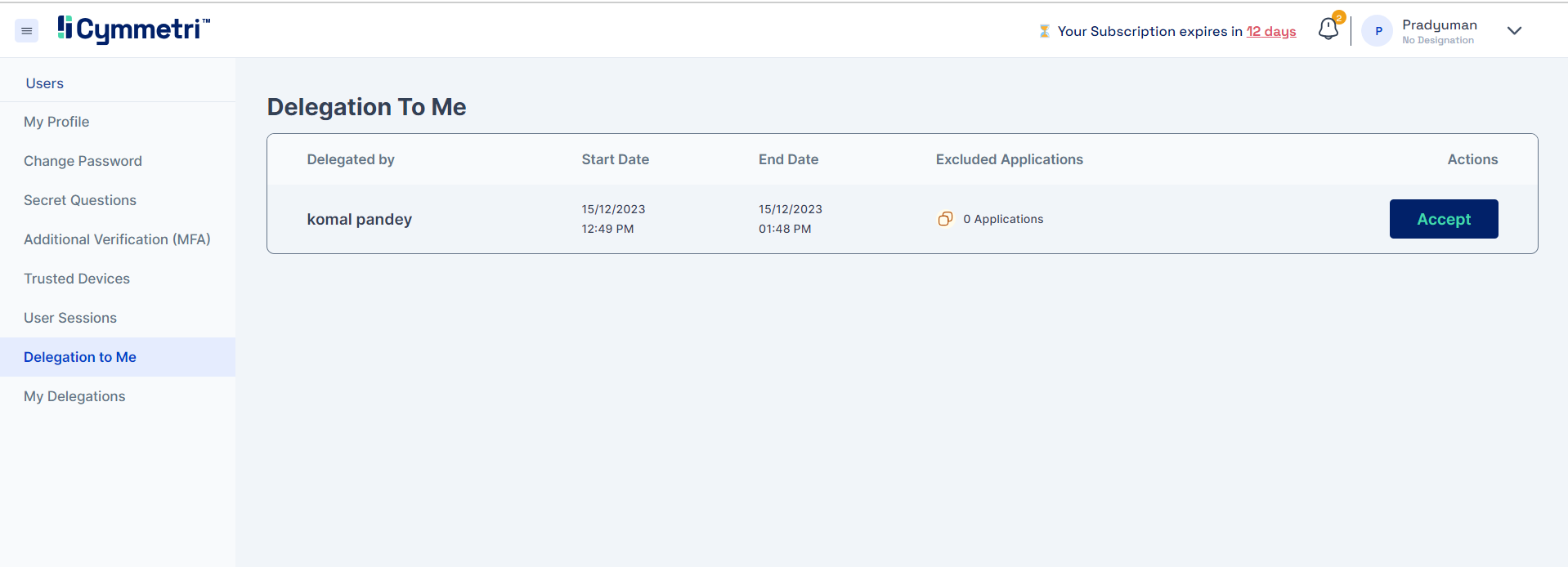 In this section the user can view all the delegations that has been assigned to him/her with details such as: Delegated By, Start Date, End Date, Excluded applications and accept button to accept the delegation.