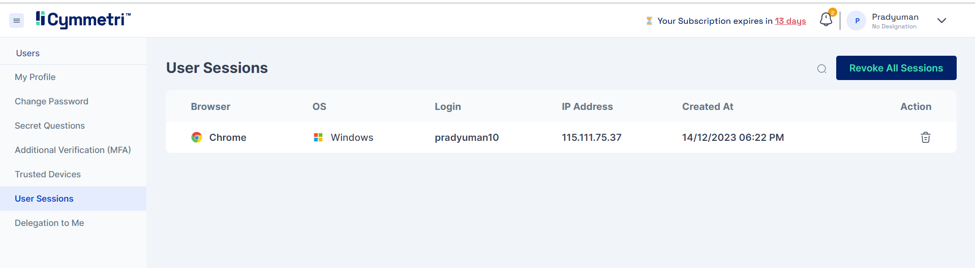 Additionally, users can choose to revoke all of their active sessions simultaneously by selecting the "Revoke All Sessions" option.