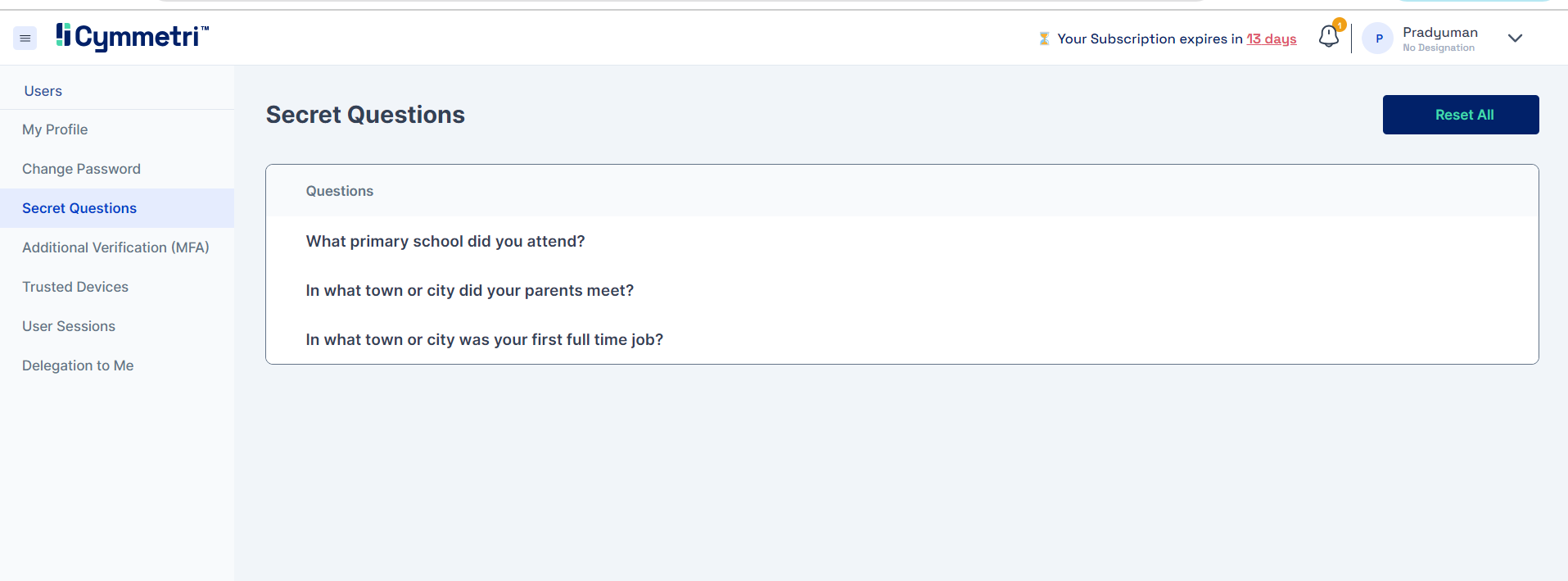 Within the Secret Questions section, users can review all the secret questions they have configured as part of multifactor authentication to log into Cymmetri. Additionally, users are provided with the option to reset these questions directly from this section.