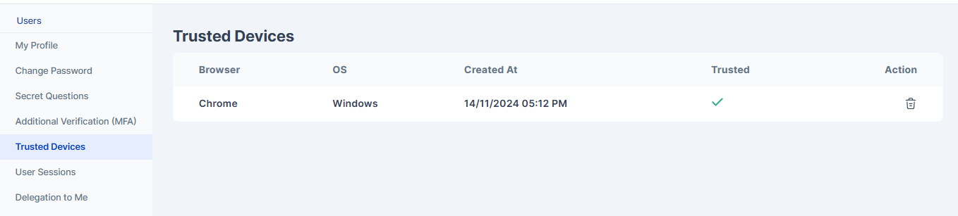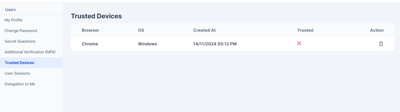 The trusted devices sections shows any values if adaptive mfa is applicable to the user and user logs in from a certain device. Based on the configuration done in adaptive mfa only after a particular number of successful logins from a device, the device becomes a trusted device. Unless and until you don't reach the specified number of successful login attempts the device appears as below where you can see a red cross appearing in the Trusted column which indicates that the device mentioned is not yet a trusted device.