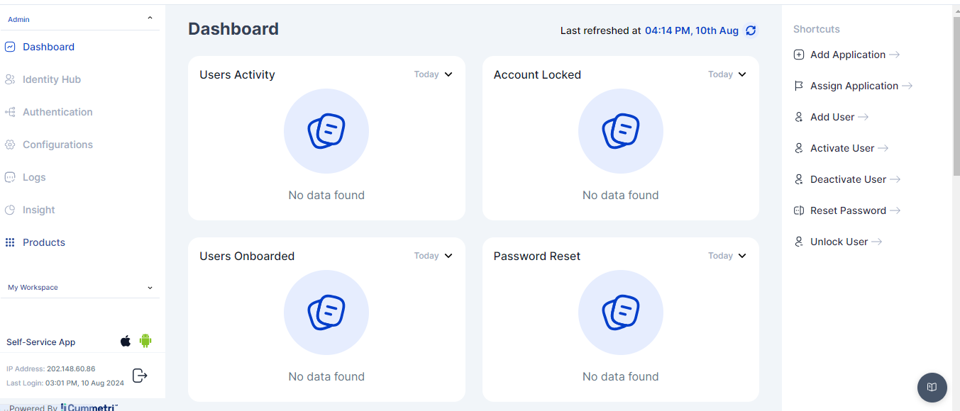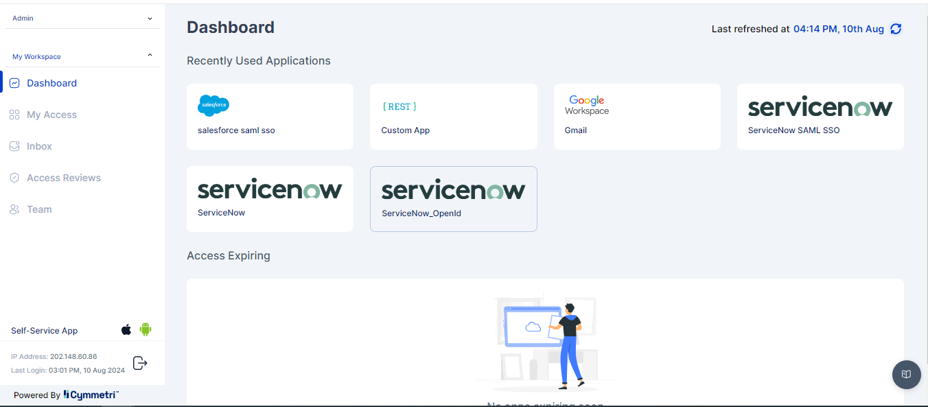 The Dashboard under My Workspace is the default page once the user has logged in to Cymmetri. This page is accessible to all users in Cymmetri. &#x20;