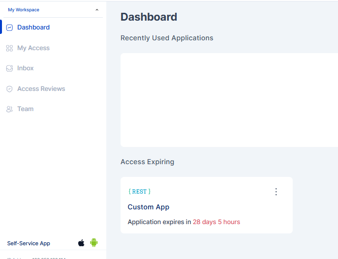 The user sees a summary of recently accessed applications. Clicking on any of these applications will result in Single Sign-On (SSO) to the chosen application. If the user has not accessed any applications recently, the system will display 'No recent apps'.