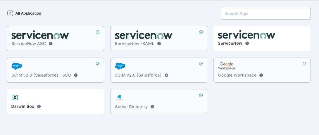 The user can view all the applications that are available for the organization. The applications already assigned to the user are indicated by a green check mark.