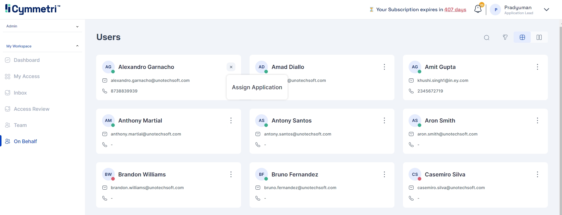 This streamlined process within the "On Behalf" section of Cymmetri enhances the user experience, making it efficient and user-friendly for authorized individuals to manage access requests and application assignments on behalf of others.