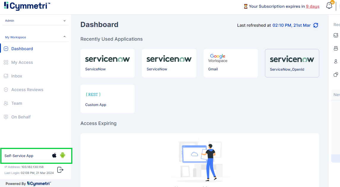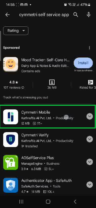 Search for Cymmetri Self Service App or Cymmetri Mobile App and then select the application as shown below: