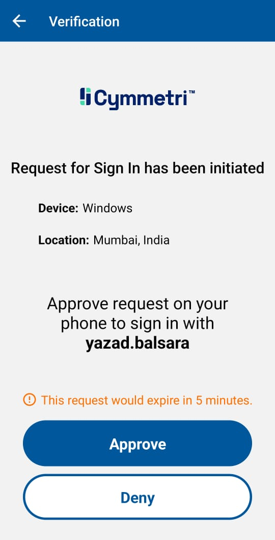 The user needs to setup the Cymmetri Authenticator for receiving the push notification on the device, for which the user needs to download the Cymmetri Verifier app. The links below can be used to download the Cymmetri Verifier App on Android or IOS: