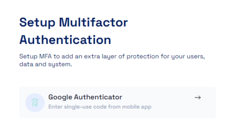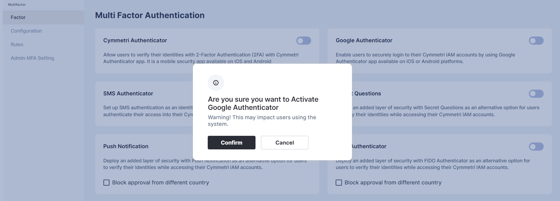 For configuring the Google Authenticator, select the Google Authenticator toggle button and click confirm to setup Google Authenticator as an MFA option