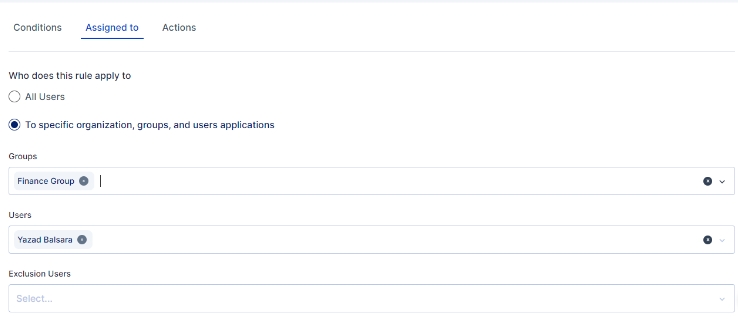 An administrator can further customize to whom the rule would be applicable by selecting user(s) or group of users in the "Assigned to" Tab, If the rule is to be applied to all the users then the "All Users" option need to be selected