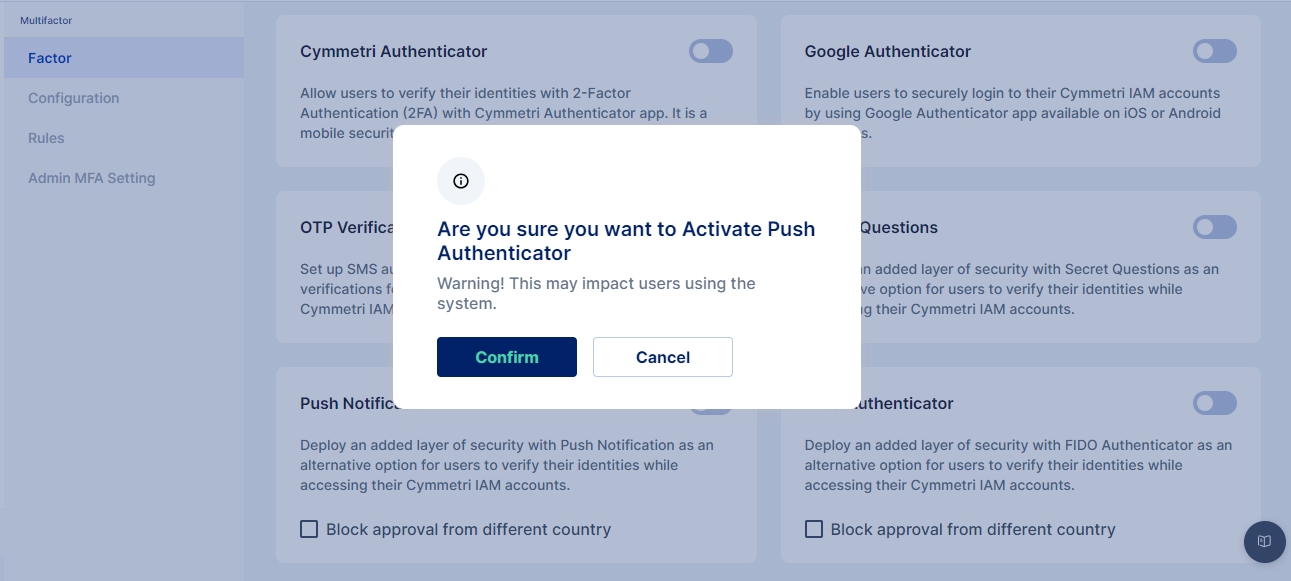 For configuring the Push Authenticator, select the Push Notification toggle button and click confirm to setup Push Authenticator as an MFA option