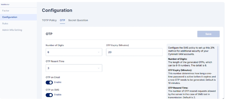Cymmetri also allow you to customize the SMS Authenticator parameters using the Configuration section. Here you may configure the values as shown below: