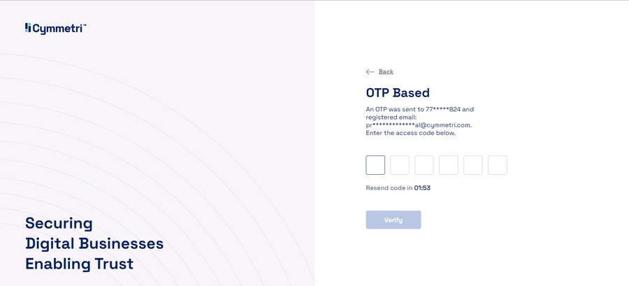 In Cymmetri, if OTP is enabled for passwordless login, the user is prompted for an OTP which is sent to the user's registered mobile number and email address during login.