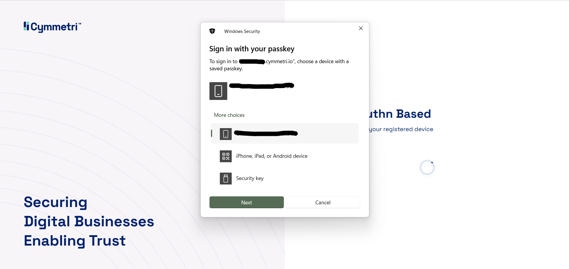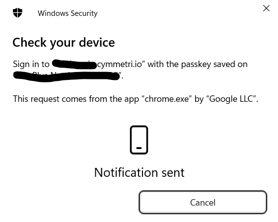 * The user's browser, in conjunction with Cymmetri's authentication flow, would prompt them to verify their identity using their registered device.