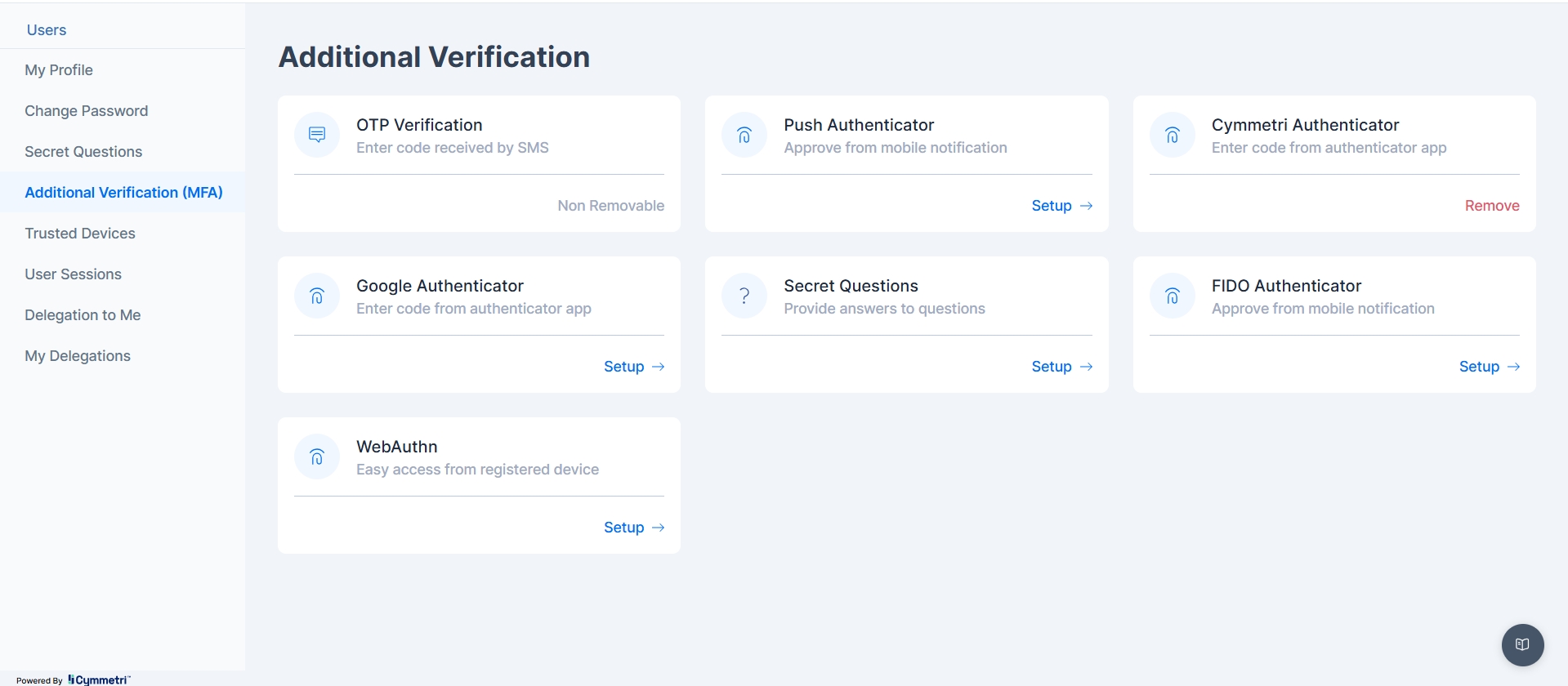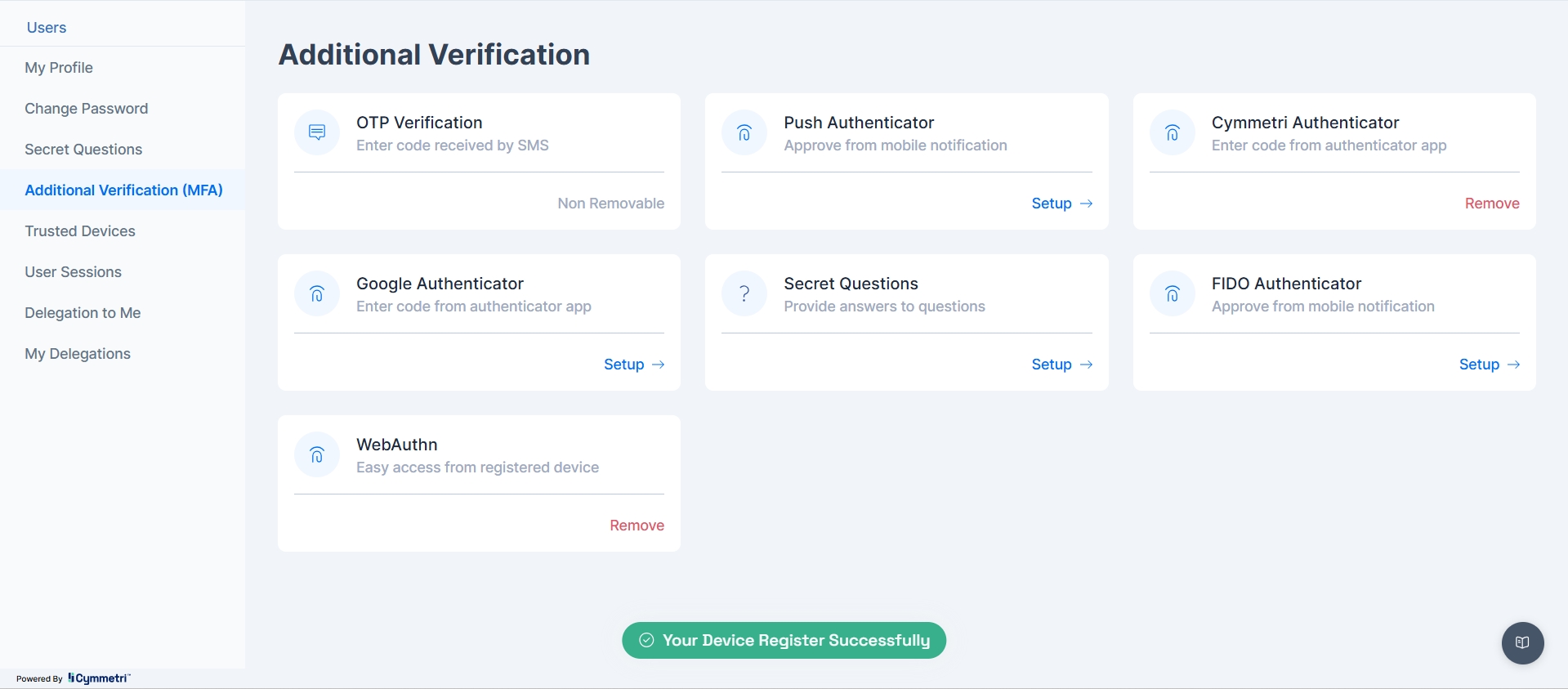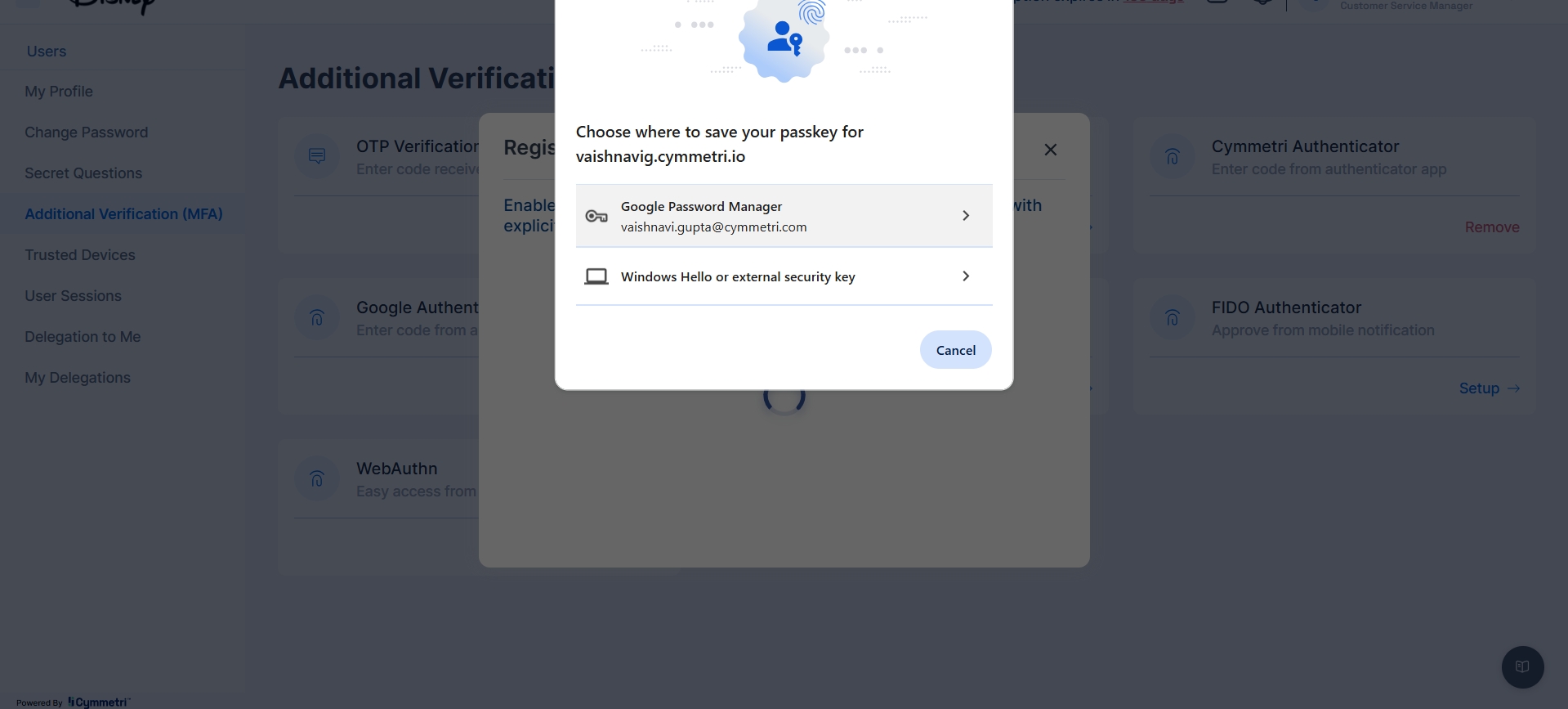 This registration process would be facilitated through Cymmetri's user portal, securely linking the public key of the authenticator to the user's identity within Cymmetri.