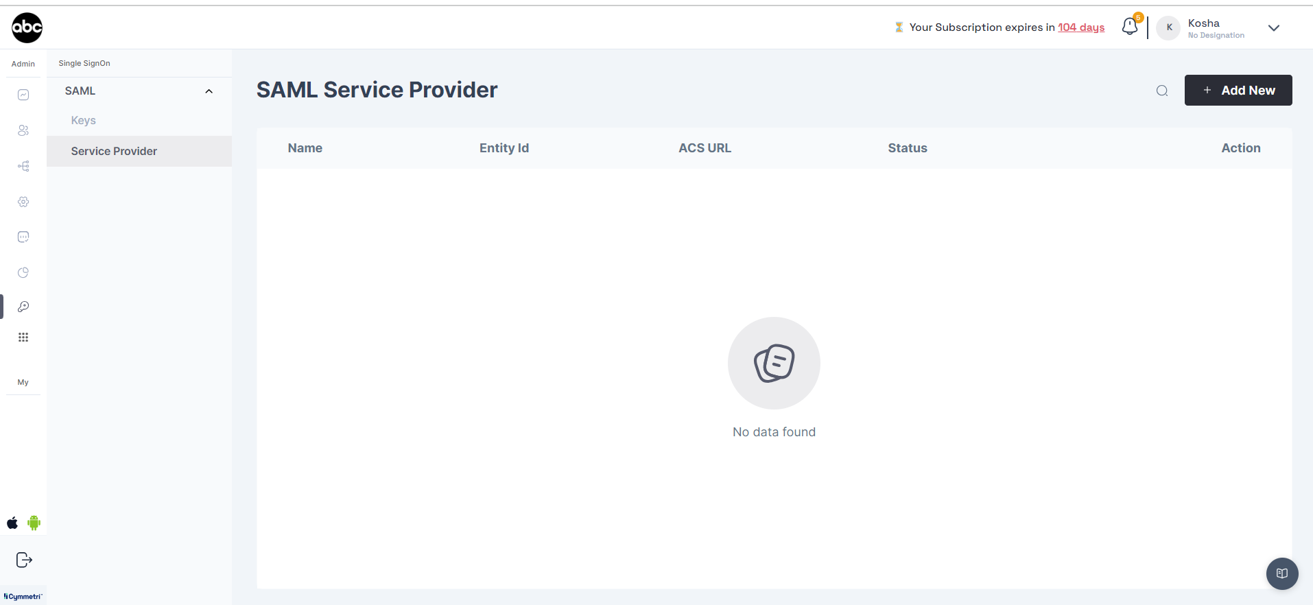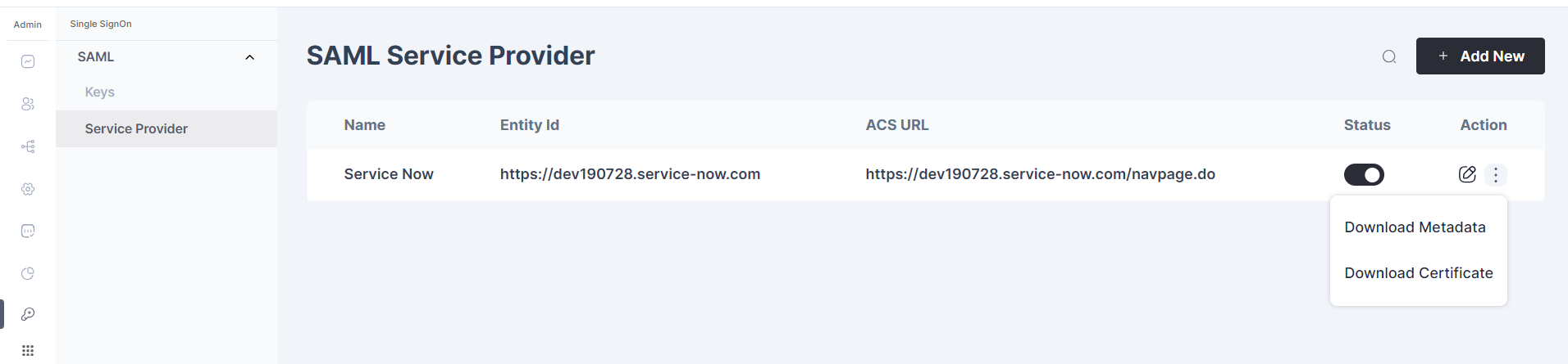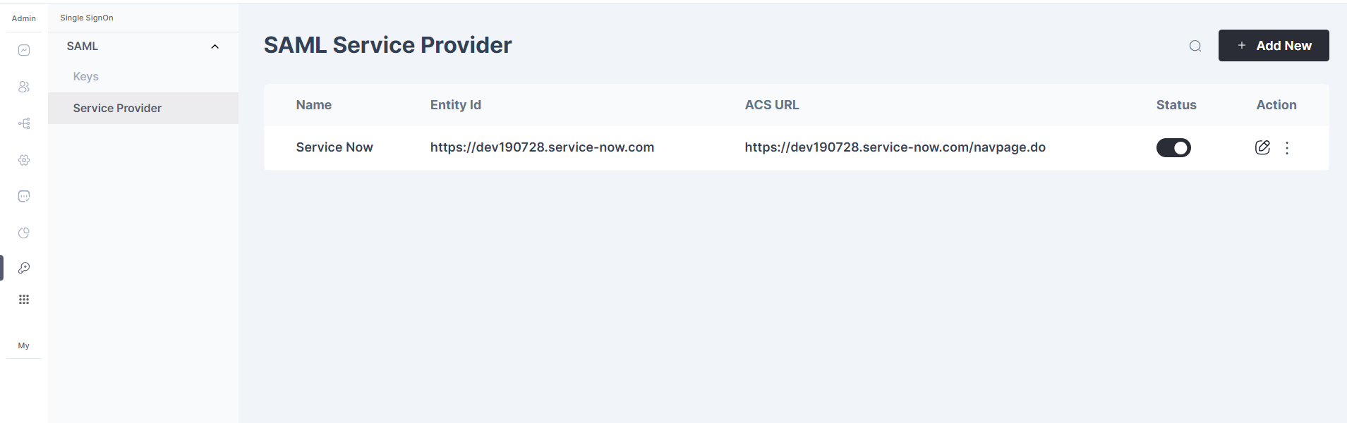 Initially, we include a SAML service provider from the Single Sign-On section under Service Providers by selecting the "Add New" button located at the top right corner of the page.