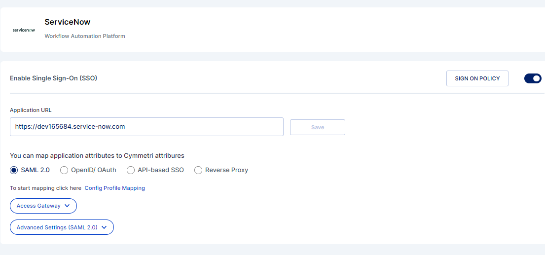Then enter the instance url in the SignOn configuration of the managed application on the Cymmetri portal.