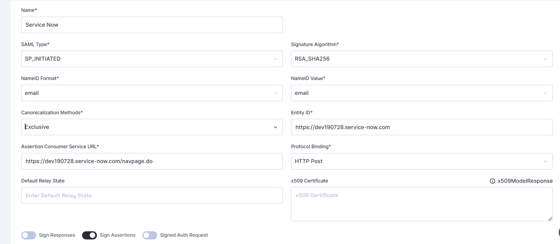 Since the metadata downloaded from ServiceNow does not indicate the use of a particular signature algorithm, let us simply use “RSA_SHA256”.