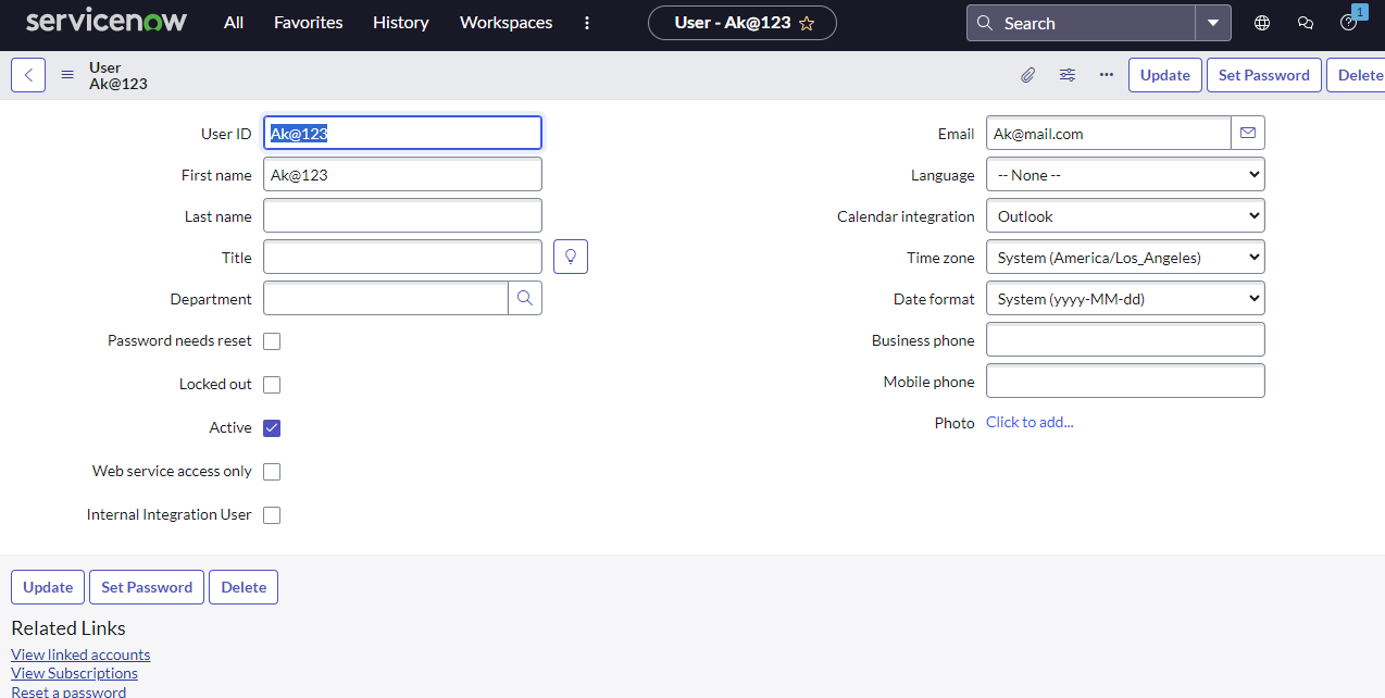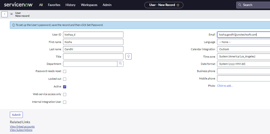 Next Create a New User in Service Now. Go to Organization->Users->New and provide the credentials of the user logged into Cymmetri as show below and Submit: