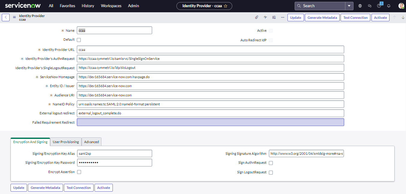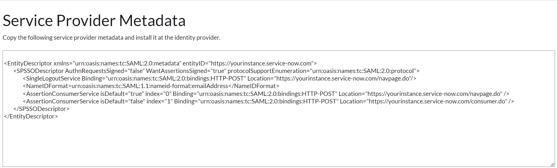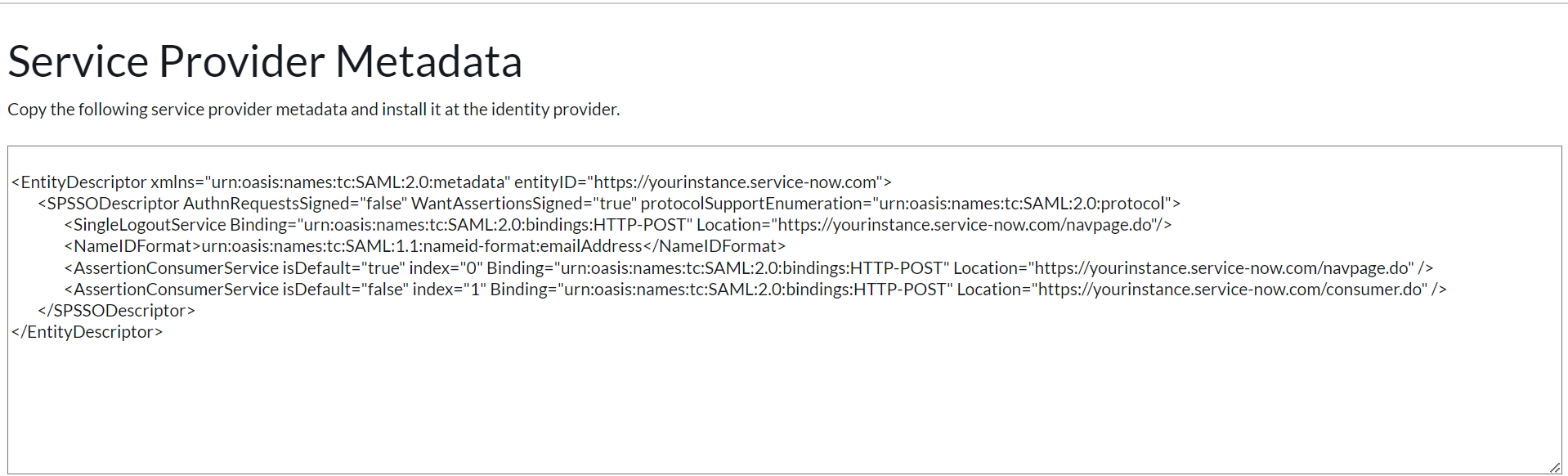 Now go back to Service Now instance and Navigate to Multi-Provider SSO > Identity Providers. Choose any existing IdP and click the Generate Metadata button. The integration automatically generates the instance's SP metadata from the system property settings.