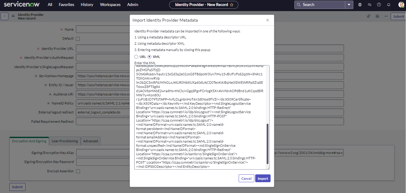 For configuring the “Request Issuer”, let us refer back to the downloaded metadata.xml from the Service Now application.