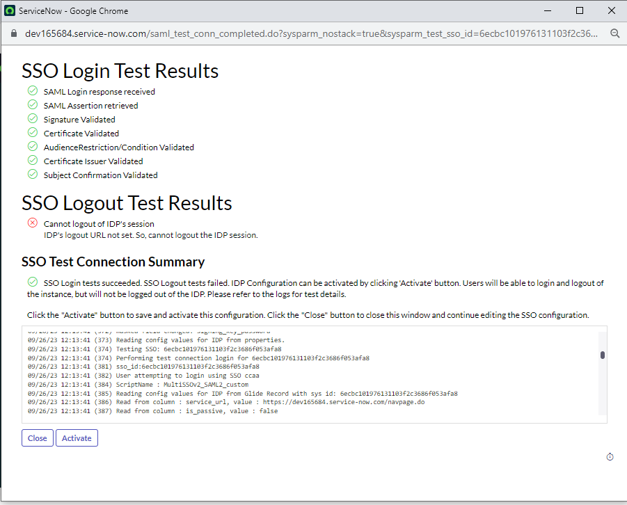 Once successfully tested you should see the below screen with successful test results. Click on the Activate button to activate the IDP.